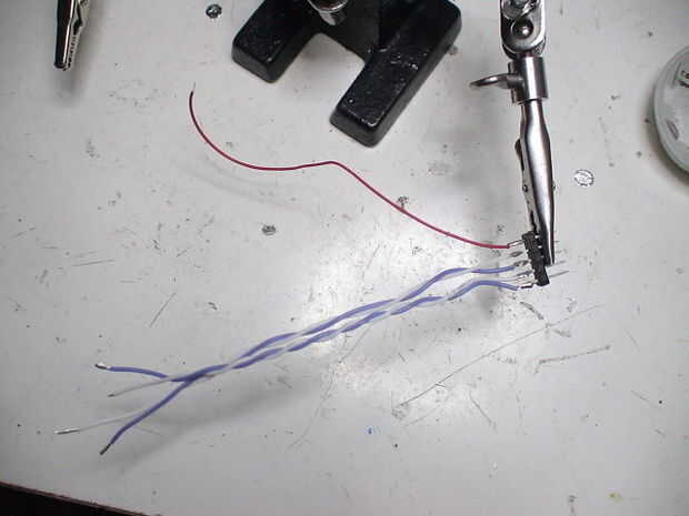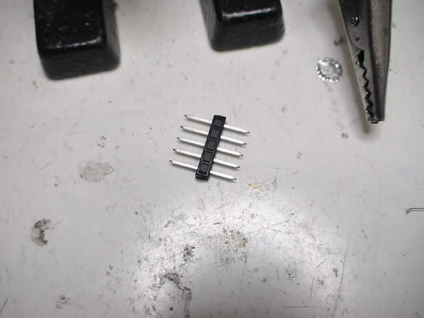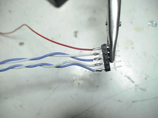 -Soldar los cables en el encabezado, guarde el cable extraño para uno de los pasadores del extremo, como se utiliza para la orientación cuando se conecta a un programador.