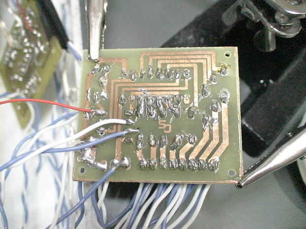 -Según el pinout de su programador. Tomar un alambre que se suelda en la cabecera y de la parte inferior (lado del cobre) encontrar donde debe ir y la soldadura. Asegúrese de que no puede tocar ninguna de las patillas circundantes.