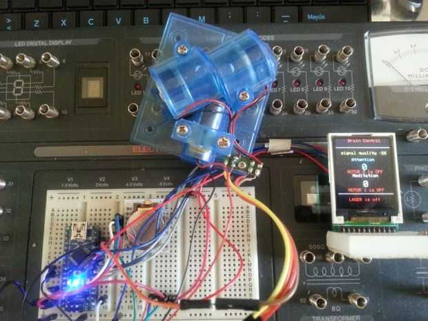 Para crear este ejemplo, uou necesita el módulo de luz láser, que conseguí en la rejilla de separación de destino después de Halloween, pero también puede usar dos motores de un viejo reproductor de CD de PC y un laser de un puntero láser baratos.
