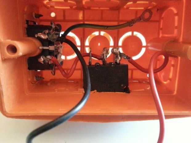La construcción es bastante straitforward; Utilice el cortador de cuchillo o caja de utilidad para cortar los agujeros para el interruptor, enchufe de alimentación de PC y dos macho clavija, en la caja de salida eléctrica plástico. Tamaño de los orificios como mejor puede y luego inserte las piezas en los agujeros apropiados. Asegure las piezas con pegamento o tornillos, si es posible. Utilice los cuadros proporcionados, para guiarte y darte una idea de cómo hacerlo. Una vez que las partes están en el lugar que necesita para las piezas de alambre juntos y soldarlos en el lugar.