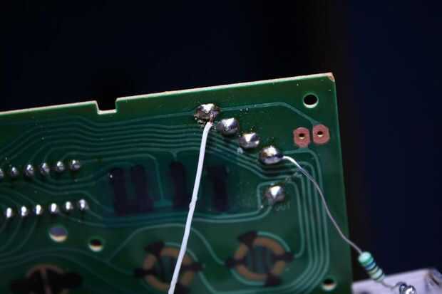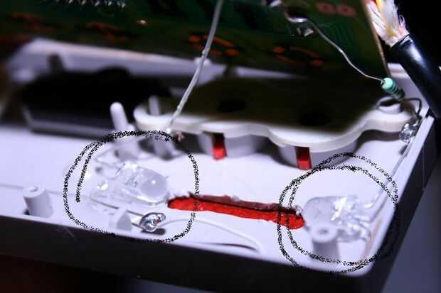 Soldar los leds y la resistencia, juntos y en el cuadro pintado. Luego la soldadura sobre el tablero de la nes, como en la imagen y el pegamento hacia abajo hasta el interior de la parte frontal del controlador. Poner justo en el borde del agujero.