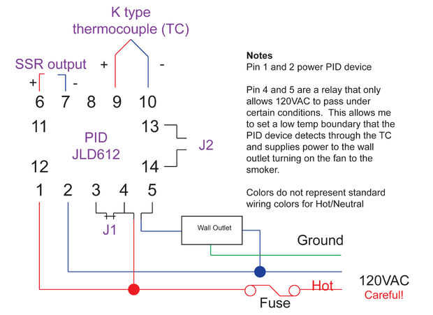 El tipo de control de temperatura el diagrama de cableado no utiliza la porción de PID del controlador. Es un simple relé de encendido. El dispositivo le permite fijar una temperatura inferior límite (es decir, 225 F) que cuando el TC dice < 225 el regulador suministra energía a la salida (ventilador), aumentando así la temperatura del ahumador.