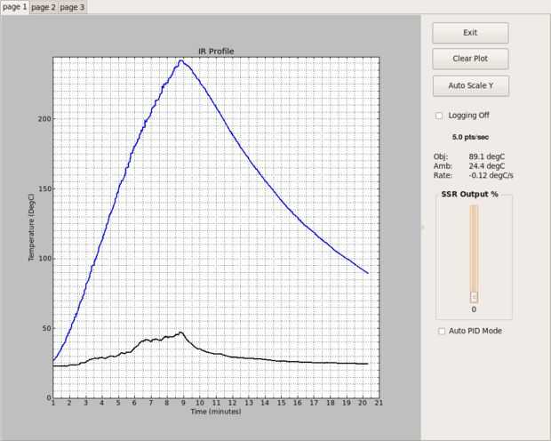 Empecé a escribir un montón de código de control PID. Pero, al final, mi sartén no la necesitaba. Simplemente encienda el sartén al 100% y esperar a que la temperatura máxima. Toma mi sartén aproximadamente 8,5 a 9 minutos para golpear el pico. Justo en el pico que gire el SSR salida y luego espera 30 segundos. Entonces, empieza en un pequeño ventilador de mesa a la temperatura de la rampa abajo. En el abajo cuesta la sartén sólo está incrementando en alrededor de-0.5 grados C/segundo. No parece haber ningún peligro de choque térmico ya que el quemador tiene tanta masa térmica.