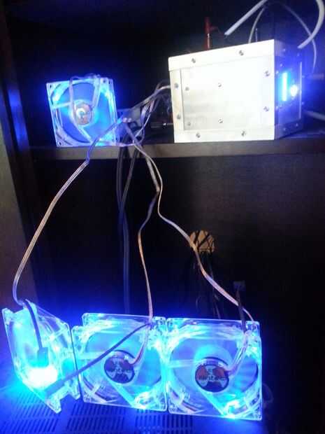 Aquí es mío en su casa. Corrí algunas pruebas antes de todos los fans. En cuanto a las fuentes de alimentación, estoy usando una fuente de PC ATX. Energía buena, regulado y ya tenía en su lugar, utilizando los carriles de 5V para otro proyecto. Tuve el 12V terminal a la espera de ser utilizado.