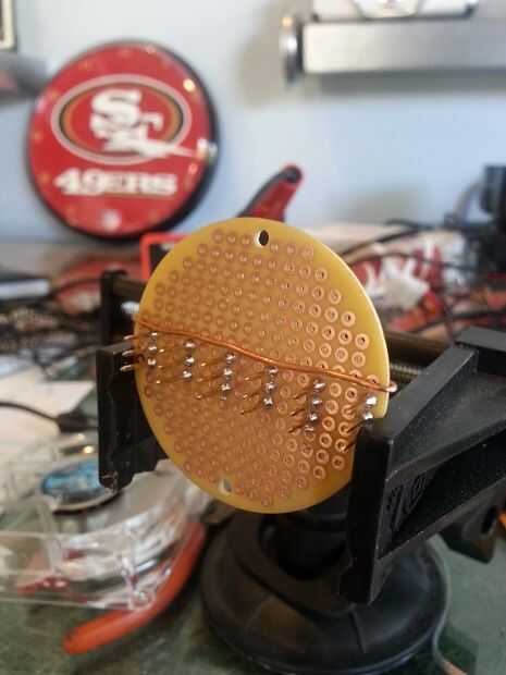 El gráfico de barras es simplemente 10 LEDs intercalados, por lo que cada uno tiene su propia resistencia. Usé 2 barras de LED que tienen resistencias de 5 en cada uno. Las barras de simplificar el cableado mucho. Solo la soldadura de las barras de resistencia entre contactos del negativo de los LEDS y un hombre encabezado para cada positivo de los LEDs, y eso es todo.