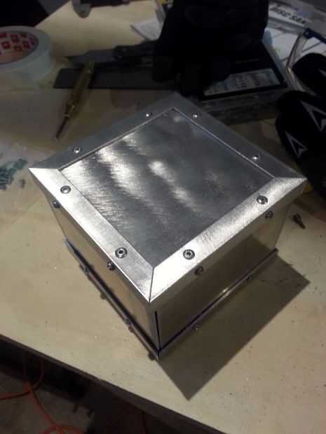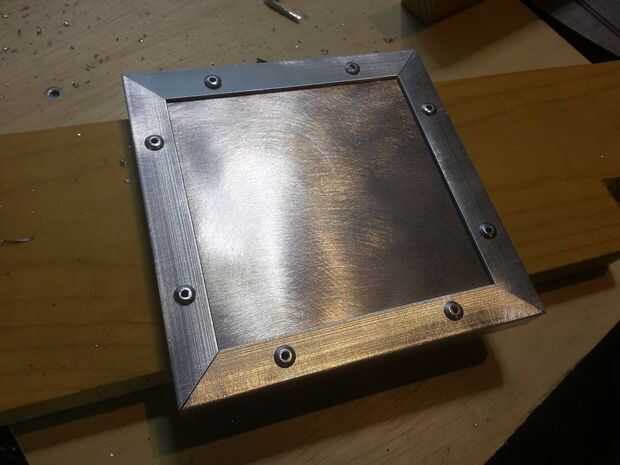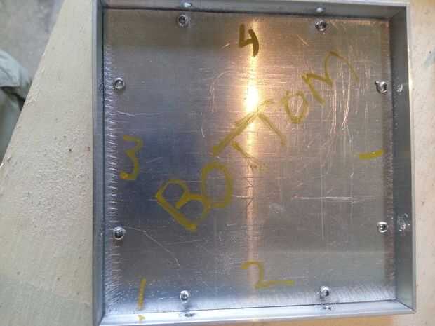 A continuación cortar los paneles planos para los lados, superior e inferior. Los paneles son pequeños y no necesitan rectitud mortíferas debido a la moldura, así que utiliza una sierra de banda y libre de manos los cortes. Remache los bordes de los paneles superior e inferior. ¿Propongo marcar todo en el interior por lo que puede mantener las cosas "derecho", derecho? Cada una de las piezas rozó cuando fui a darle un mejor acabado. Para conectar los paneles laterales, taladro y golpee los paneles para aceptar los tornillos del #4, como se ve arriba.