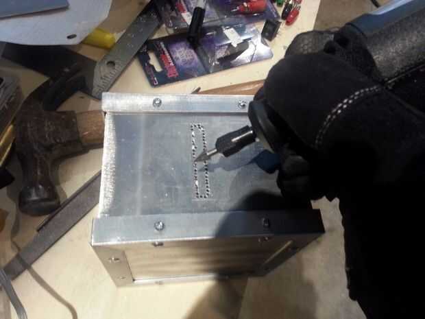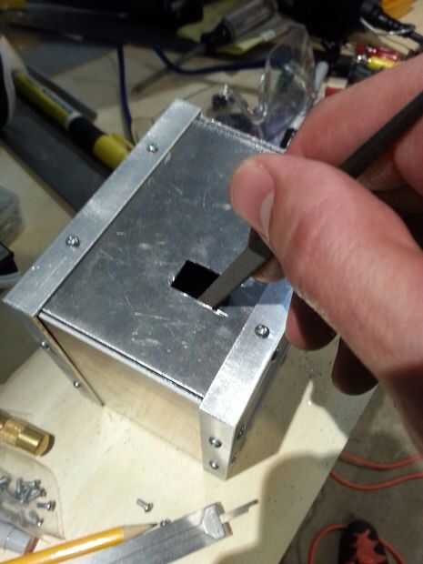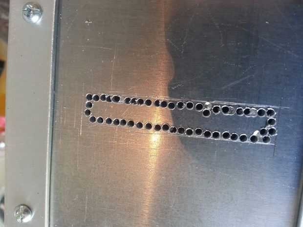 Corte los agujeros cuadrados es un dolor real, pero es necesario para algunos de los componentes. Es necesario para una buena mirada acabada en el gráfico de barras, los terminales del ventilador y el interruptor de encendido. una serie de pequeños agujeros de taladro y luego martíllelo hacia fuera. Cuando martilló hacia fuera, empezó a deformar el aluminio que es bastante delgado, así que usé una dremel para tallar los agujeros pequeños hacia fuera un poco que hace la percusión mucho más fácil y más rápido. El borde va a ser muy irregular y debe ser alisado con una lima de mano. Es un buen ejercicio, pero vale la pena.