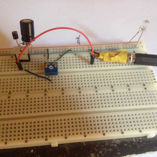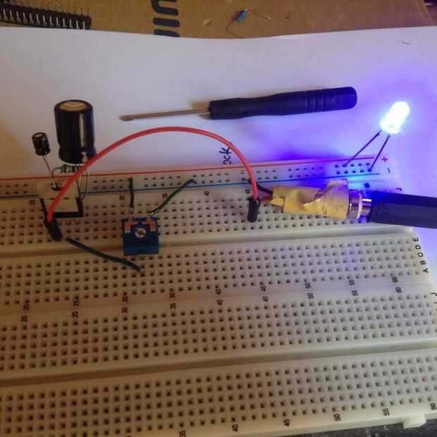 Conectar un led a la parte negativa y positiva de la placa, recuerda el led ya está en el ánodo y el corto es el cátodo. Conecte las tomas y enchufe el cargador a una toma de corriente, el LED se tenue y brillante a medida que gire el potenciómetro en direcciones opuestas