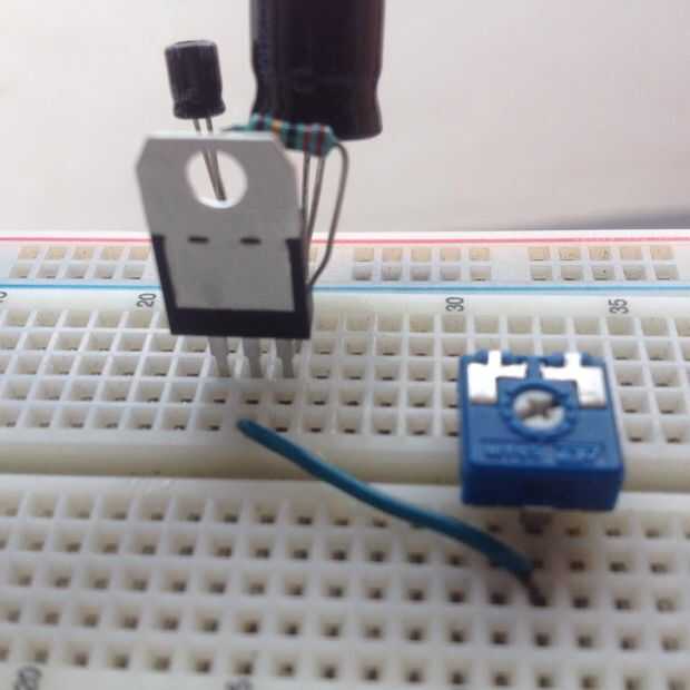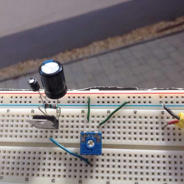 del potenciómetro a la Vadj de L7805CV (medio de pines), conectar el + del potenciómetro a la + de la protoboard y hacer lo mismo para el negativo-del potenciómetro a la de la placa es donde se tomara la tensión de.