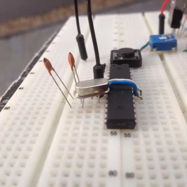 Conectarse el oscilador de reloj de cristal de pin9 pin10 del chip arduino; Conecte un condensador de 22pf cerámico disco de pin9 a pin8 y el condensador del pin 10 a pin8.