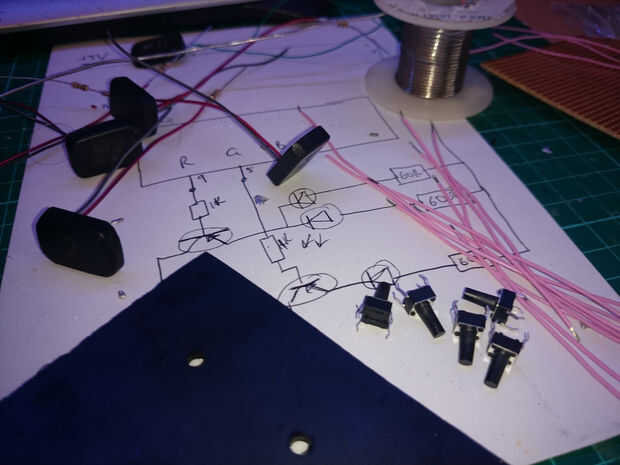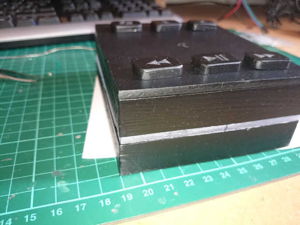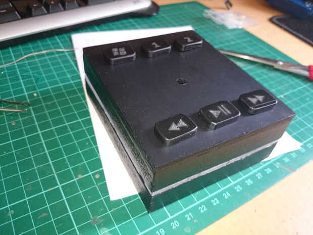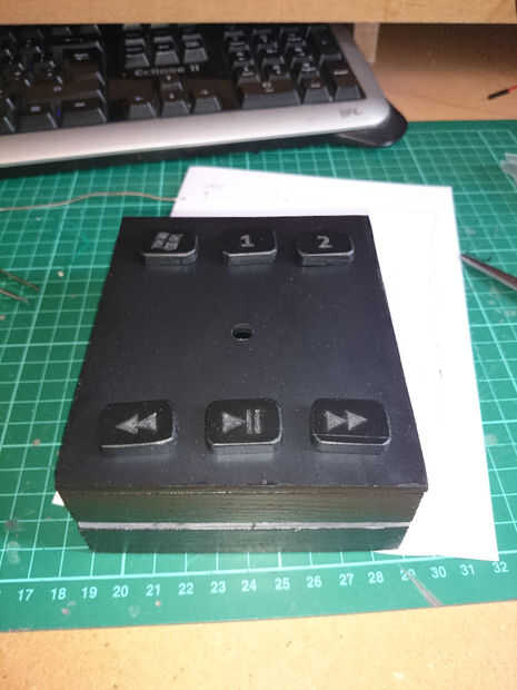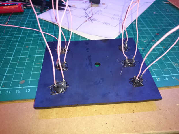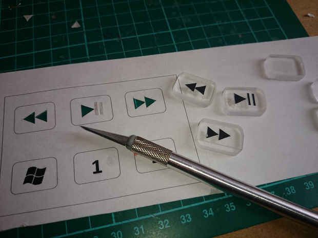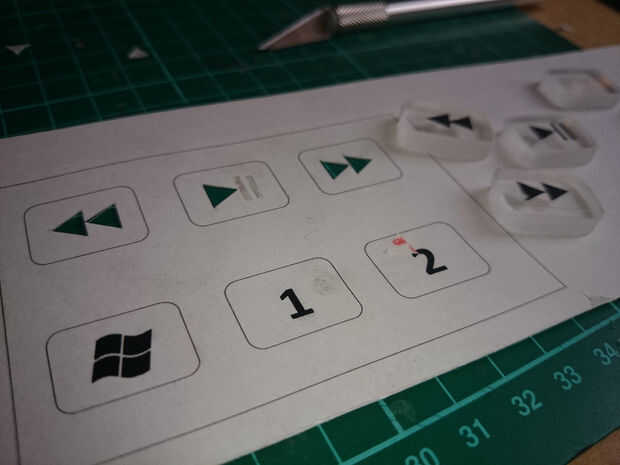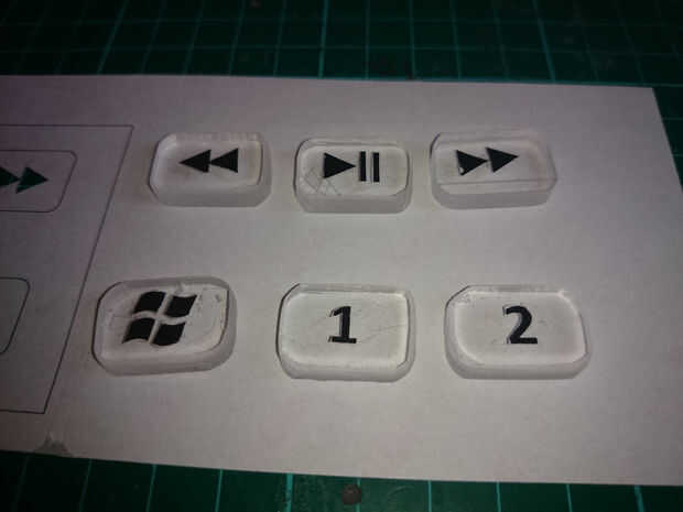 Diseña el aspecto de los botones en el editor, rociar las piezas de acrílico negro, imprime el diseño y procedió a grabar los símbolos en el acrílico. El siguiente paso fue añadir los LEDs SMD para el acrílico, y luego finalmente alinear los botones y taladrar los agujeros para colocar los switches táctiles. Los interruptores estaban pegados y los alambres soldados a ellos. Aunque parecía bastante bueno, no funcionó muy bien porque había utilizar pegamento caliente para fijar los botones. Tres de los seis botones realmente funcionó a la perfección, pero el resto fueron pegado así que decidí que esto no sería lo suficientemente resistente para el uso diario.