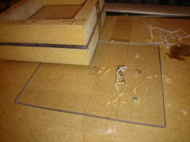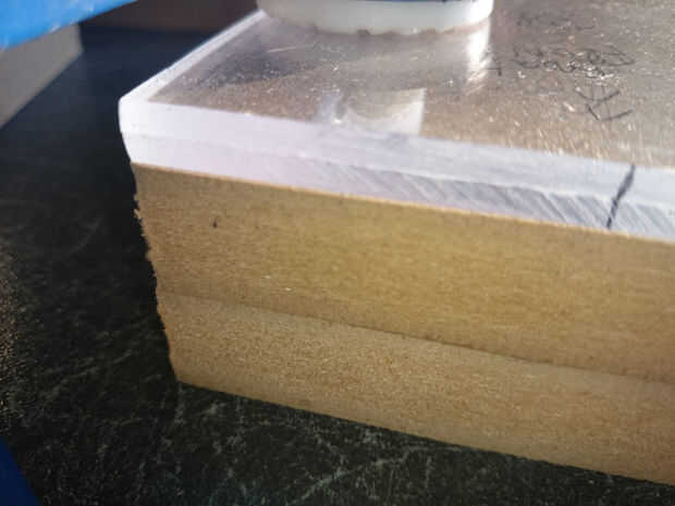 Según el diseño, necesitamos 2 x MDF 18 mm espesor 130 mm x 100 mm y un acrílico 5 mm de grosor x 130 x 100 mm. Esto es para la capa del emparedado que es crucial para el efecto de borde iluminado. Corté mi MDF con una sierra de calar y el acrílico con una sierra de mano 32TPI.