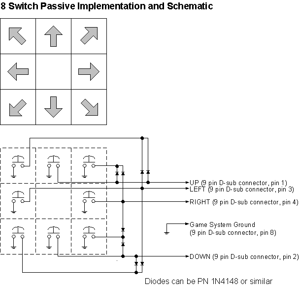 Para aislar el extra cuatro interruptores de los cuatro existentes, diodos deben utilizarse como se muestra en el diagrama para conectar los cuatro cables de la interfaz de joystick. Con este arreglo, moviéndose diagonalmente puede lograrse de la manera normal utilizando dos interruptores o pulsando un botón diagonal.