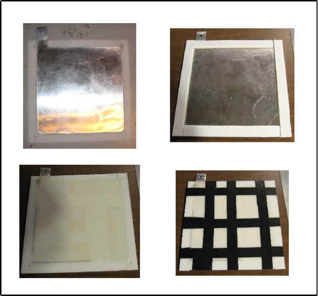 Los interruptores consisten en una superior y una inferior de contacto. Cada una de las Asambleas de contacto están construidos con aluminio y láminas de polietileno grueso con 1/16 como se muestra en los diagramas. Un contacto de metal de techo de parpadear se une a cada una de las hojas de polietileno de dos. Encontré eso doble-cinta de la alfombra cara trabajó bien para sujetar el aluminio a la hoja de poly. Es importante que el aluminio se apretadamente a la hoja de polietileno, para que no Afloje y colgando, ponerse en contacto con la placa de aluminio en el otro conjunto contacto del interruptor.