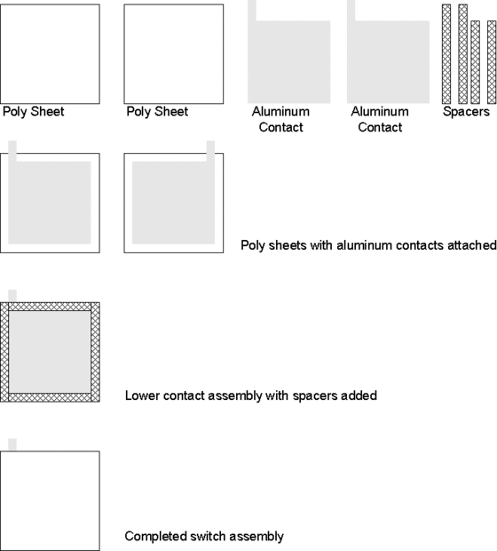El contacto superior se monta encima del menor contacto, con el material del separador en el medio. Consulte el diagrama que muestra cómo las capas apila para arriba. Por último, todo el conjunto se mantiene unida por envolver cinta alrededor en ambas direcciones. El conjunto del interruptor completo se muestra en uno de los cuadros a continuación.