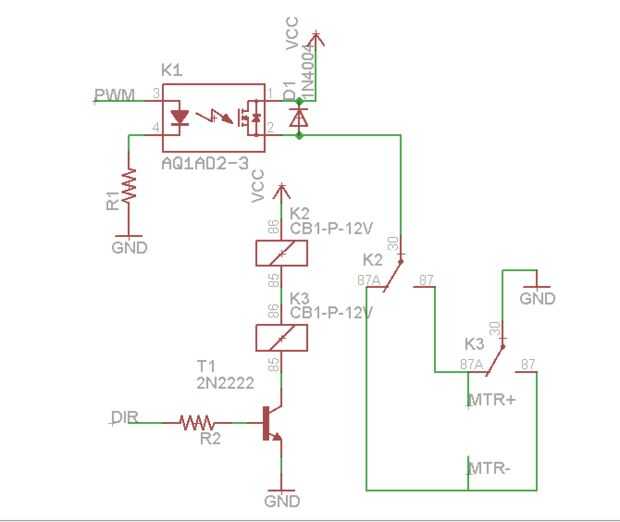Alimenta a la RSS de una señal PWM para variar la velocidad del motor y dar el transistor un estado digital para dictar la rotación del motor. Recomiendo que tener rotación hacia adelante en los contactos normalmente cerrados en caso de quema una bobina. No cambiar la rotación del motor al acelerador a fondo, pero los relés pueden tomar algún abuso.