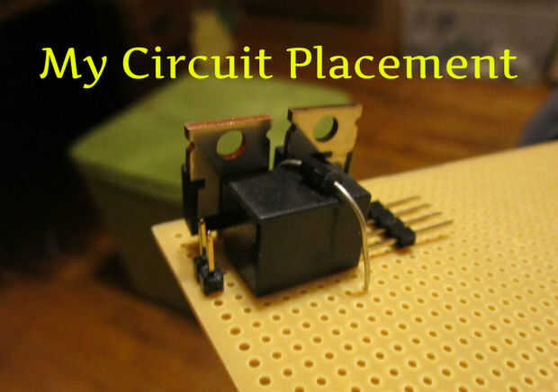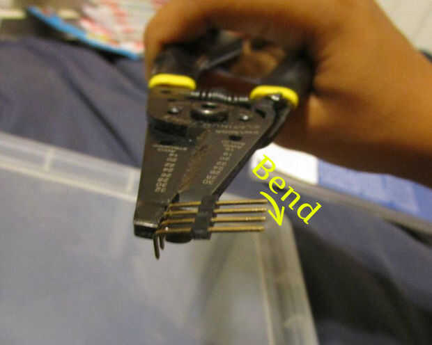 Coloque todos los componentes en el perfboard. Colocarlos para que fácilmente puede soldar el circuito el diagrama de esquemas se muestra arriba y todavía encajan perfectamente en la placa. Para la tira de pin solo Quite un incremento de 2 pines y un incremento de 4 pines (no tienes que hacer el incremento del 2 pin si desea el motor directamente al circuito de la soldadura). Reducir el incremento de 2 pines más corto en ambos lados y uso de peladores de alambre doblan el extremo largo de su incremento de 4 pin en un ángulo de 90 grados. Si un alicate no tiene esta función sólo tiene que utilizar un juego de alicates.