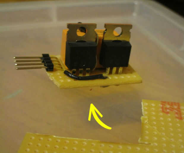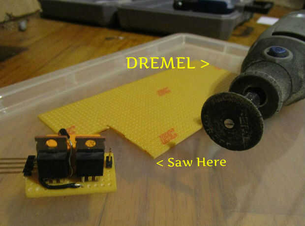 Para que utilizar esto en pequeños sistemas tal y controladores o robótica la siguiente cosa a hacer es cortar el circuito. Cortar al tamaño del circuito que hice pero se puede cortar a cualquier tamaño que desee o para diversas funciones. Sólo asegúrese de que usted mantenga el circuito funcional. Cortar el perfboard desde la parte inferior para que se puede cortar por debajo de los pines de control y potencia. Utilice el DREMEL o cualquier Sierra pequeña para cortar hacia fuera. Me encontré con la DREMEL para ser la herramienta más fácil para cortar el perfboard pero uso cualquier medio por favor para hacer el trabajo. Al final, asegúrese de que los pines de control y el poder son capaces de ser pluged en un protoboard o en otro circuito.