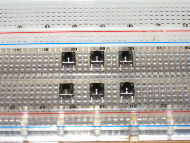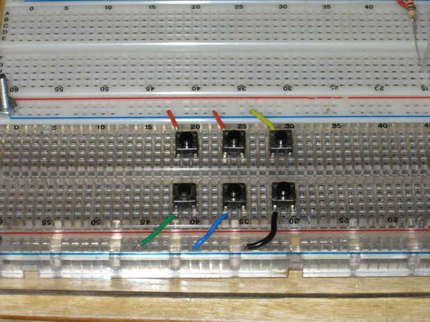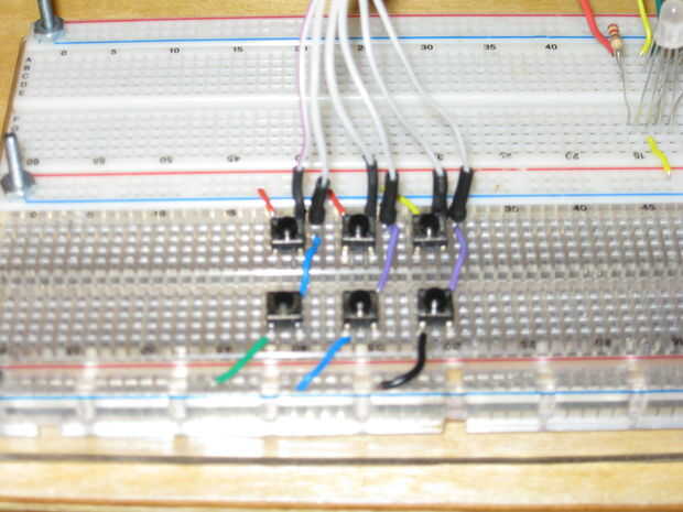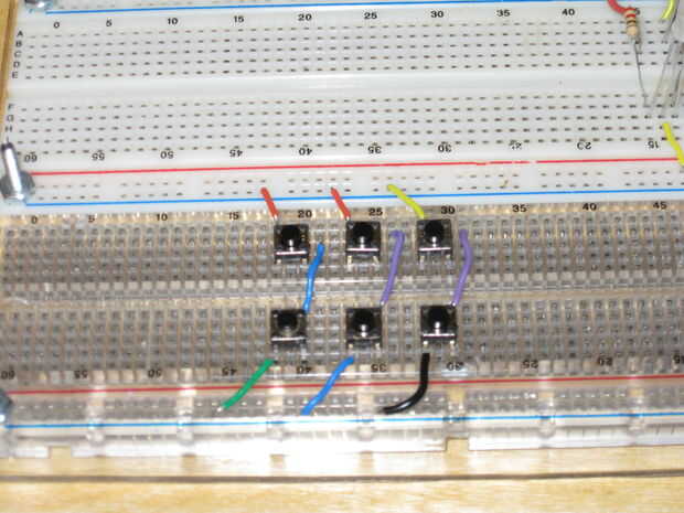 En el botón inferior 3 queremos poner un cable puente allí otra pierna para acumular en la parte superior de la Junta de pan. Esto le ayudará a mantener los cables bien y ordenado. Ahora podemos tener un buena 6 longitudes de cable puente y sujete a la otra pierna de los botones. Utilicé un trozo de cable de cinta para ayudar a mantener los cables organizados.