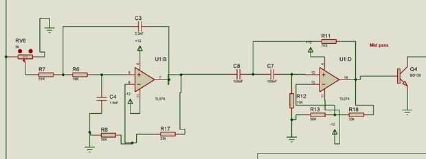 Todo esto puede cambiar a su gusto configurando el condensador y las resistencias en cada uno de los filtros. Utilicé estas calculadoras, que trabajó excelente: