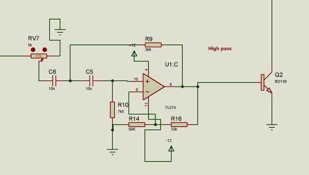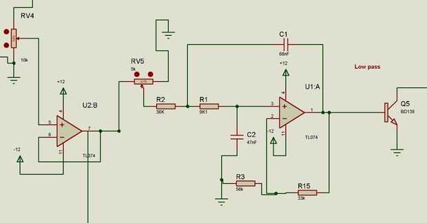 Empiezo con tener un op-amp (U2:B) con un bucle de retroalimentación negativa de la salida de AGC un potenciómetro para cada uno de los tres filtros. La tensión luego pasa por cada filtro, y luego a un transistor final de conducción el voltaje a tierra cuando recibe tensión. Los potenciómetros regulan la amplitud de la señal, que es útil si por ejemplo quieres las frecuencias bajas a la luz más que otros.