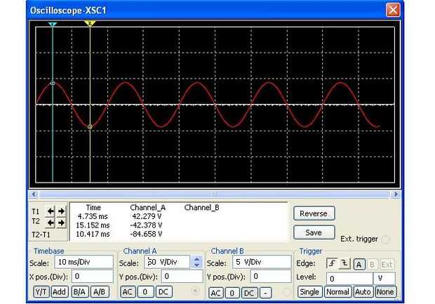 Ulazni izmjenicni señal je sinusoidni napon maksimalne vrijednosti 42V me frekvencije 50Hz. A je maksimalni napon koji amplituda daje. Nama treba efektivni napon koji zapravo koristi sklop, taj napon je napon za drugi korijen manji od maksimalnog napona.