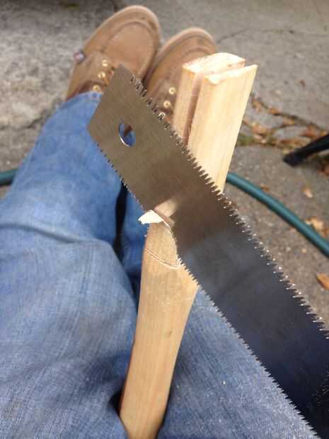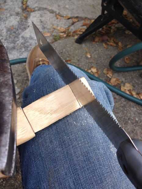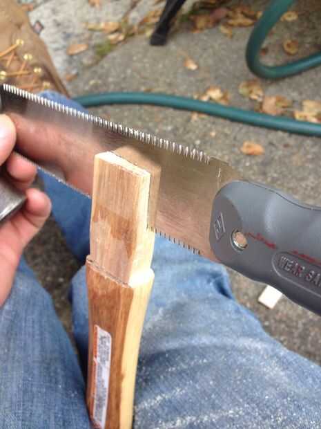 4. Recortar fuera de esta línea desde la parte superior del mango hasta la línea de fondo (otra vez con la sierra japonesa o una sierra de cola de Milano)