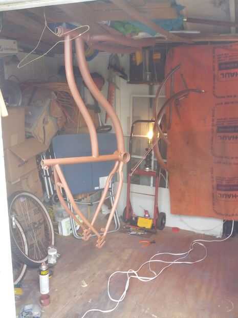 Ahora debe tener todas sus piezas limpiadas y listas para pintar. Esperemos que ya haya decidido sobre un esquema de color. Decidí pintar el marco de un color rojo brillante y las defensas, manivela y blanco del protector de cadena. Dejé el manillar y las ruedas sin terminar. En retrospectiva, debo han cubierto les con por lo menos unas capas de capa clara, como que ya están empezando a recolectar moho otra vez, desde que dejé el metal pelado, así que tenlo en cuenta si usted decide no pintar cualquiera de las partes.