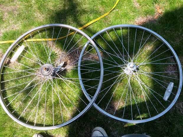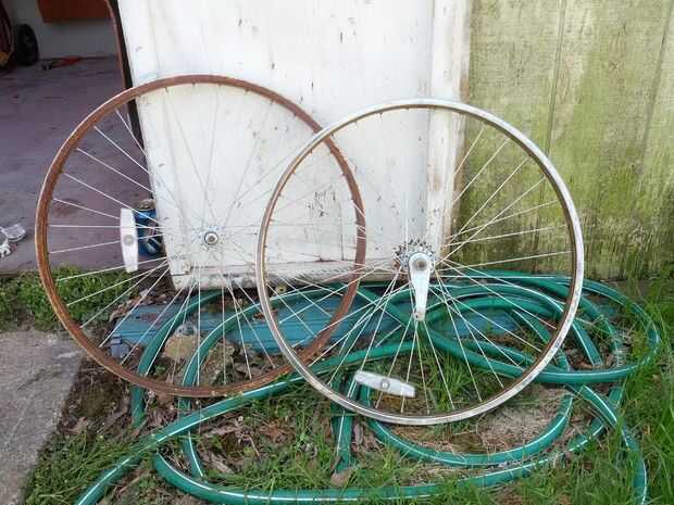 Espera de la pintura se seque, decidí hacer las ruedas. Estas ruedas fueron casi completamente cubiertas de moho. Utiliza mi amoladora para limpiar el moho del lado de los bordes, luego fue a la ciudad con un cepillo de alambre entre los radios. Esto puede ser desperdiciador de tiempo, dependiendo de cómo corroídas son sus llantas. Es una pena, pero el resultado final merece la pena. Usted puede limpiar los rayos con papel de lija.