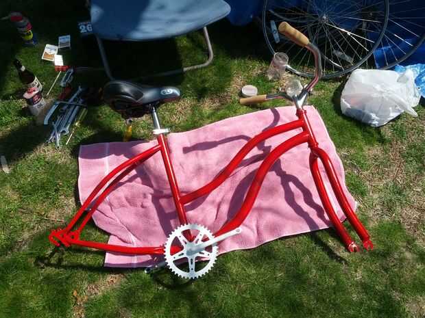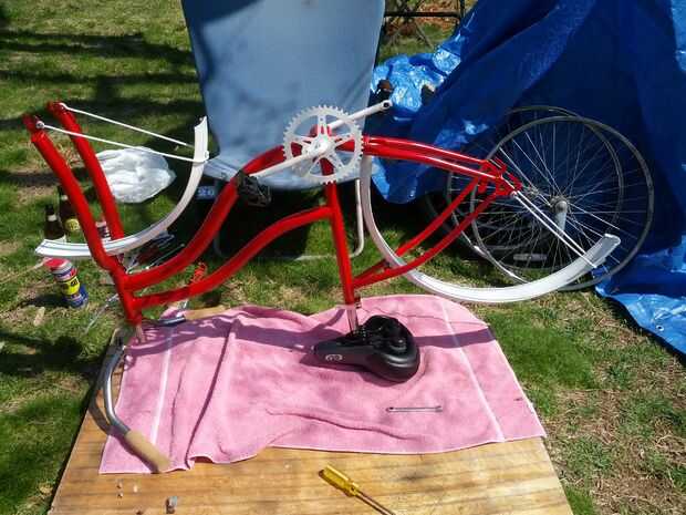 Esta es la parte de diversión *. Retire y seque cualquier parte que tenía en su balde solvente remojo. Todas sus piezas deben limpiar y secar en este punto. Todo lo reúne. Planificar el proceso de montaje para facilitar las cosas a ti mismo. Pongo el manillar y asiento trasero en primera por lo que ya aguanté la bici boca abajo. Después fue la biela y los cojinetes (paquete de grasa en los cojinetes primero). Entonces el guardabarros, pata de cabra y cadena. Cuando vuelva a instalar la manivela, puede que necesite ajustar la tensión del cono, la primera pieza que atornille a la izquierda que mantiene los rodamientos en contra el marco. Demasiado apretado y duros a los pedales. Demasiado flojo, y los pedales se tambalean. Realizar los ajustes finos hasta que estés contento con la forma de que la manivela gira en el marco, entonces el cono en su lugar con la tuerca y la arandela de la cerradura. Compruebe y asegúrese de que la manivela todavía gira libremente, como las cosas pueden cambiar de puesto a veces como usted está apretando.