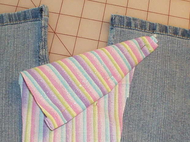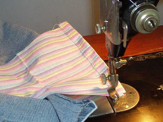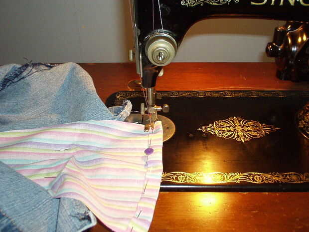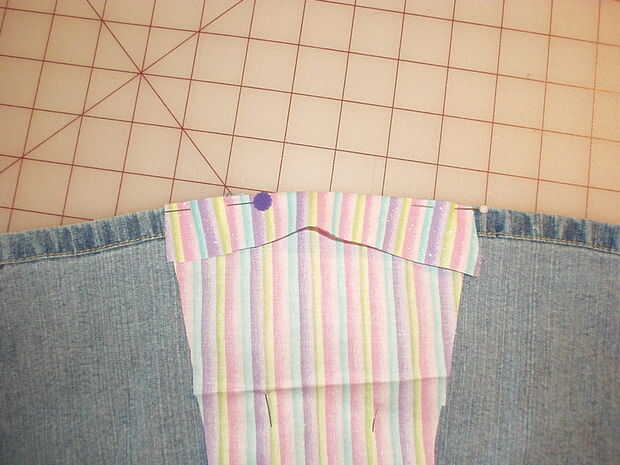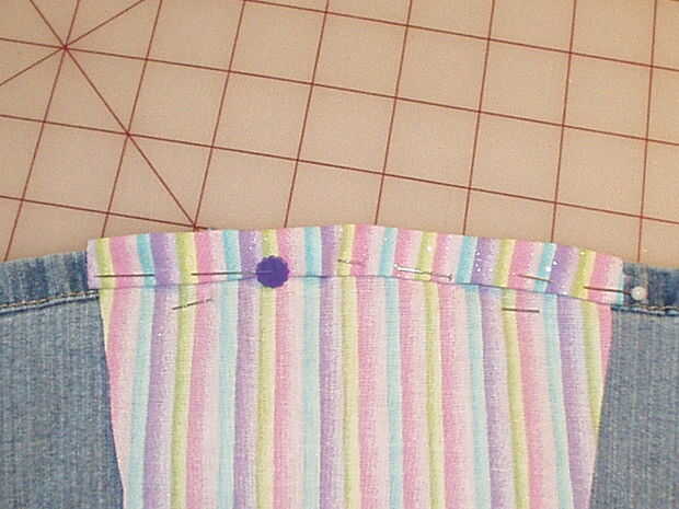 Voltee su trabajo a la espalda y pliegue el borde del inserto sea que incluso con los dobladillos de la pierna. Pliegue en el borde y pin el dobladillo hacia arriba en el inserto, pero no pin a las piernas. Que desea colgar gratis para que pueda llevarlo a la máquina de coser y coser el dobladillo por todo el borde doblado.