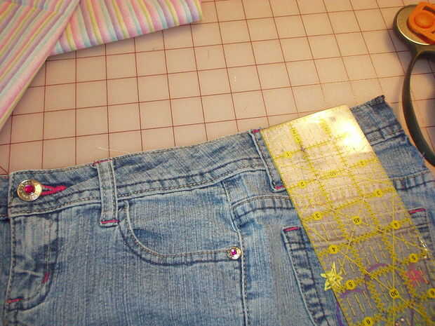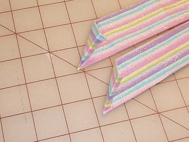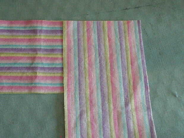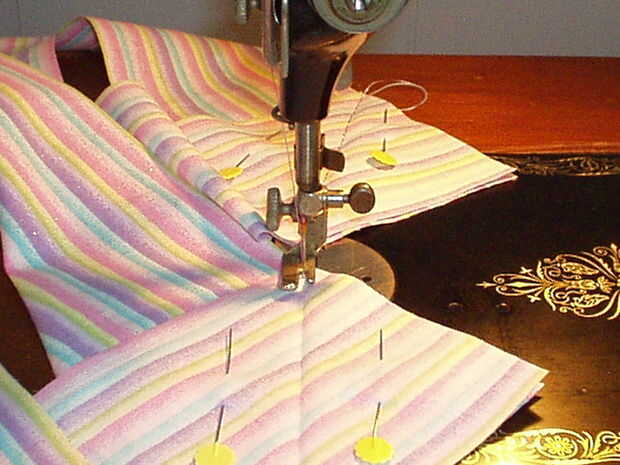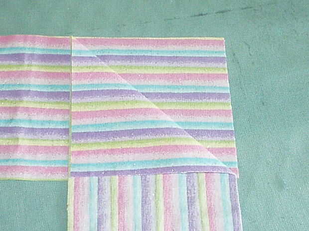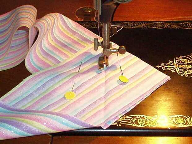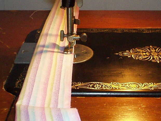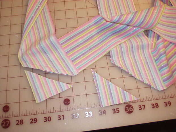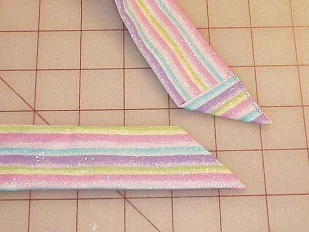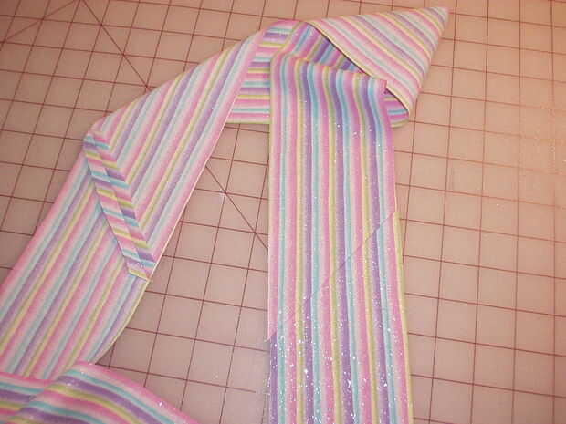 Medir la longitud de los bucles de cinta y cortar unas tiras que son dos veces que medida plus ½". Mi remanente de tela hacía corta, así que tuve que cortar 3 piezas para obtener la longitud que necesitaba. Necesita cerca de 2 yardas, así que si el tejido lo permite, 2 tiras de corte enfrente de orillo a orillo será perfectas. No quiero coser las piezas en una costura recta como parece incómodo cuando se hace. En su lugar, coloque las tiras perpendiculares entre sí en la esquina y doblar la pieza superior hacia atrás como se muestra. Plancha un pliegue. Despliegue y pin, luego coser en el pliegue. Si usted ha tenido más de dos piezas, solo coser uno tras otro hasta que las piezas se unen en una tira larga. Recorte las esquinas y presione la costura abierta. Doblar la tira en la mitad, derecho contra derecho juntos y coser. Gire a la derecha de la tira hacia fuera y presione bien. Presione hacia atrás unos ¼" en el crudo termina, luego doblarlas tal como se muestra y coser este redil hasta forma un punto triangular de los extremos de la corbata de la cintura.