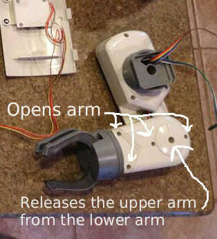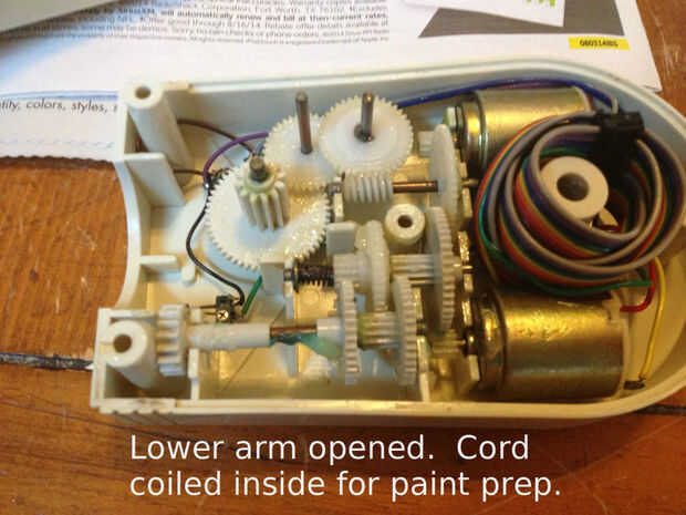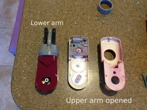 Los brazos tienen un tornillo en el codo que une el brazo superior e inferior. Separar estas dos partes. Ahora quite los tornillos que sujete la parte delantera y trasera las placas de los brazos superiores e inferiores. Verás los engranajes dentro. Mirar los engranajes; ¿están sucios? ¿se engrasan? ¿están alineadas? Si los engranajes están en buena forma cerrar los brazos, si no, tomar una foto de los engranajes y luego retire los engranajes y motores y sepárelos cuidadosamente.