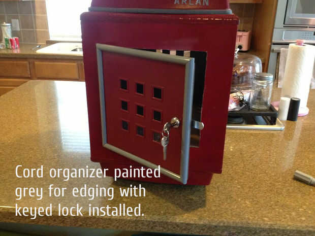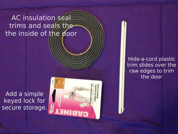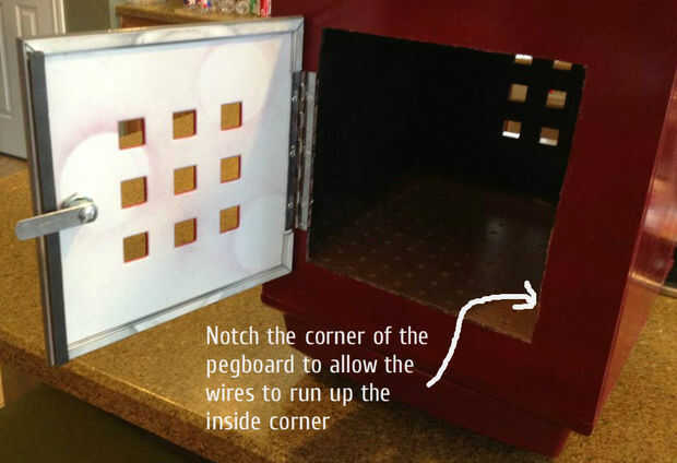 Utilicé el cuadro archivo de altura extra pero se me ocurrió que este era gran almacenamiento potencial. Yo tenía el cuadro de archivo extra para experimentar, así que utiliza un panel de la caja extra y corte un cuadrado grande de una puerta. Usé una Dremel con un disco de corte de plástico. Cortan un cuadrado de apertura (apenas más pequeño que la puerta) en la base. Quería la caja de almacenaje para ser seguro, así que compré una cerradura con llave. Usé una tira de cordón de cuero y cortar las piezas sobre los bordes de la placa a la puerta un aspecto acabado. Corté los bordes en un ángulo de 45 grados para hacer agradables curvas cerradas.