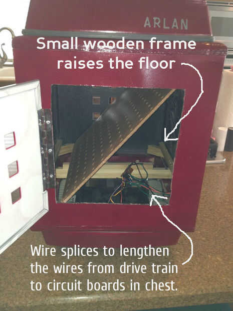 Ahora que la caja va a ser utilizado para el almacenamiento que necesita un piso. Construir un marco simple para soportar un piso levantado que todo lo de las ruedas dan vuelta mantendrá. Usé 1 "x 1" palo guarnecido y lo apilados. He utilizado este método en lugar de un 1 "x 3" dio vuelta a su lado porque tenía el 1 "x 1" en mi garaje. Con el marco construido, corté un pedazo de pegboard para crear un piso. Cabe agradable y apretado en la parte inferior de la caja. El pegboard no se sujeta a la estructura, esto permite a los estudiantes de mi hermana levantar el piso y ver los engranajes en acción.