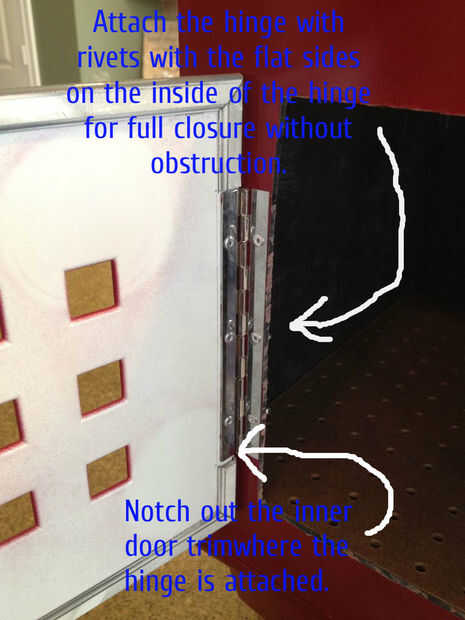 Para sujetar la puerta a la caja solía una pistola de remache fije una bisagra simple a la puerta y a la caja. los remaches creados un piso bonito acabado en el interior de la bisagra, lo que le permite cerrar completamente. El lado alto del remache se oculta bajo ajuste del encargado de la cuerda.