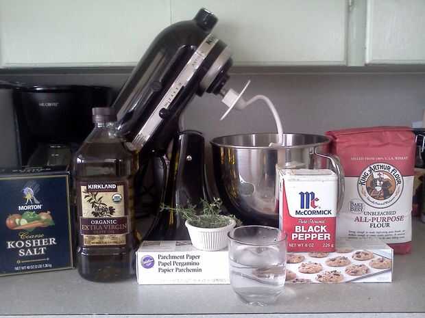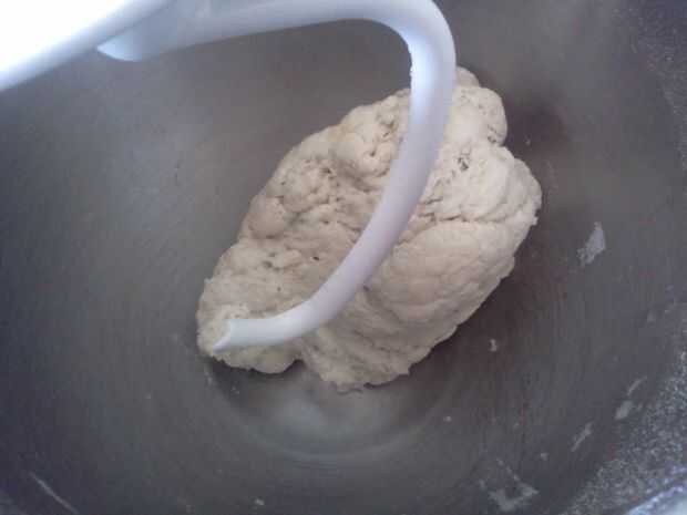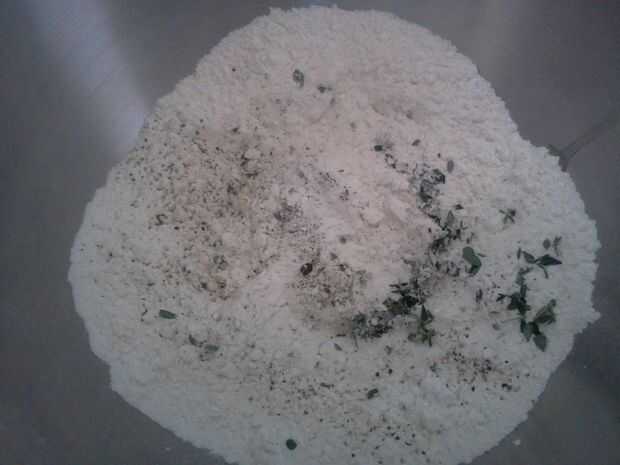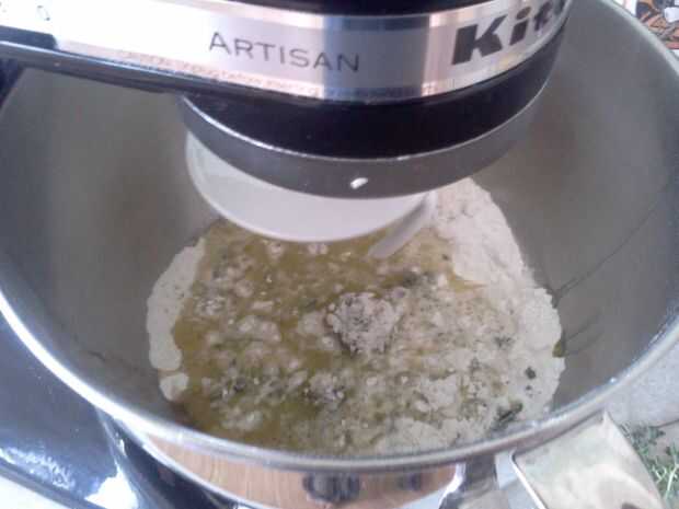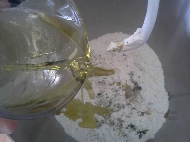 Añadir la harina, sal, pimienta y tomillo a la batidora. Remover para distribuir condimentos. Agregue lentamente el agua tibia y el aceite. Mezclar en medio hasta que se forme masa de bola.