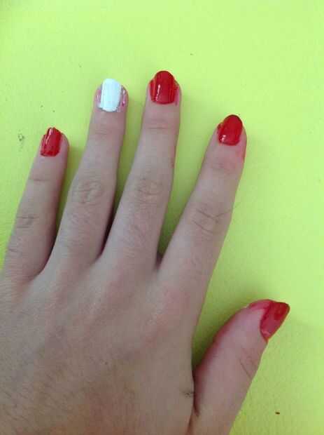 Tienes que pintar todos los dedos rojo excepto el dedo del anillo, que pintará de blanco. Pido disculpas por el descuido. Quería llegar a esto rápidamente. Además, estaba tratando de hacer mi mano... :/