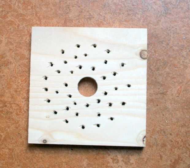 Perforar los agujeros en la madera de la chapa. Poner los agujeros en el centro juntos por lo que esa pieza se puede quitar fácilmente.