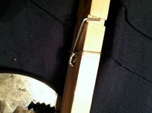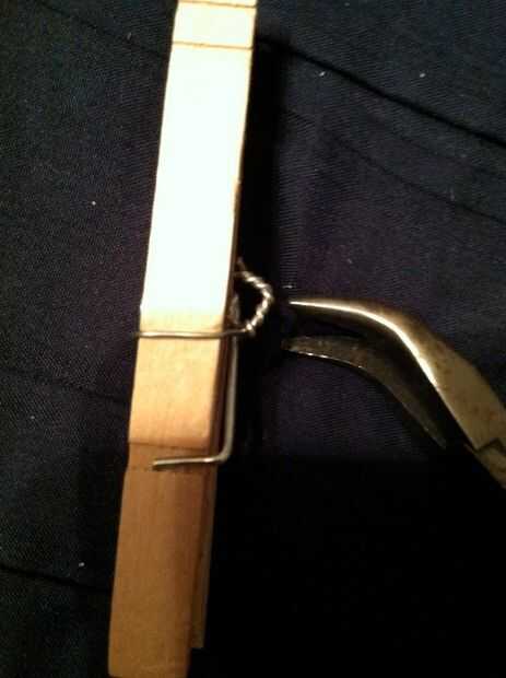 Corte el alambre envuelto a aproximadamente 1/2" largo con el cortador de alambre. Doble el extremo con forma de "U" con los alicates doblados de la nariz. Empuja la espalda final entre los trozos de madera para que no corte a nadie o dañar la ropa. Puré con los alicates. La última foto muestra como luce el pin terminado.