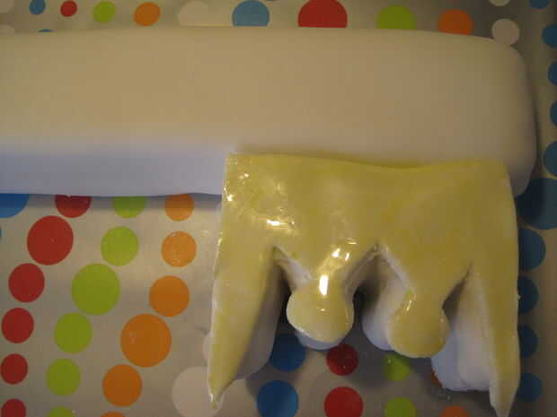 Cortan una pieza superior de fondant (completo con los detalles de punta redondeada). Pido disculpas por no tener una foto de este paso, la foto que tengo ya tiene la "pintura" sobre el pastel.
