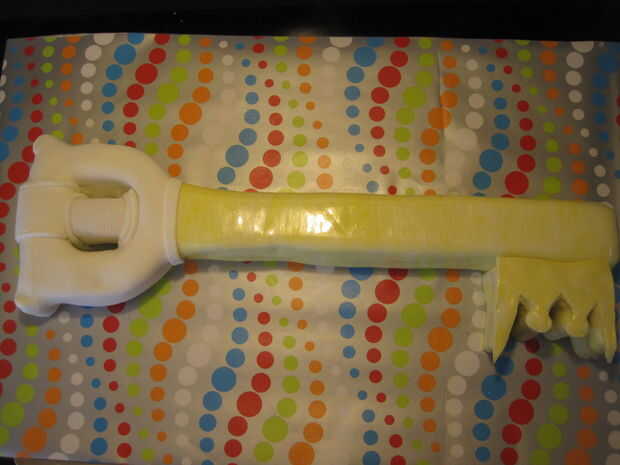 Mezcle aproximadamente 1 cucharada de extracto de almendra (también se puede utilizar vodka) con alimento amarillo colorante para conseguir el color que desee. Aplique la pintura en el fondant todo la espada sobre hasta la manija. No descarte el amarillo "pintura". Lo necesitará más adelante.