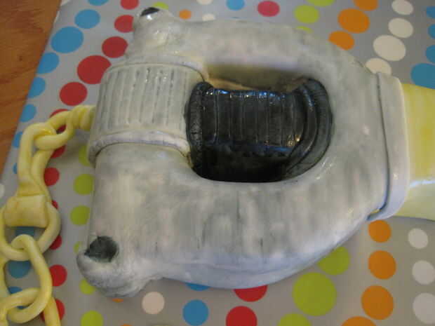 Para el mango, mezcla de 1 cucharada de almendra extracto con polvo de Perla plata, encontrado en las islas en tiendas de arte (o brillo comestible de uso) y un poquito de colorante negro de decoración de pasteles. Utilizar esta mezcla en el área de la manija exterior. Usted puede necesitar pintar esta zona más de una vez.