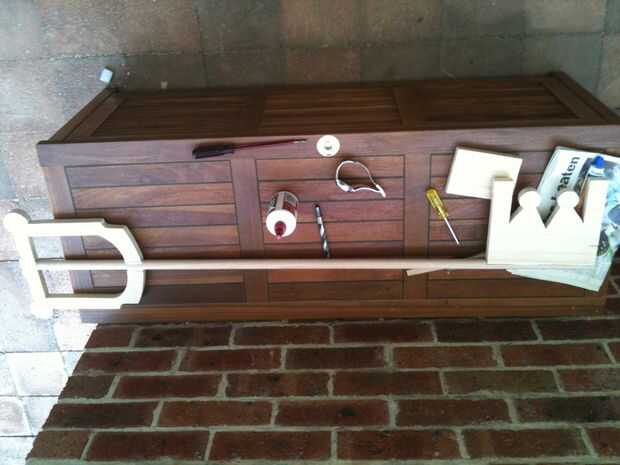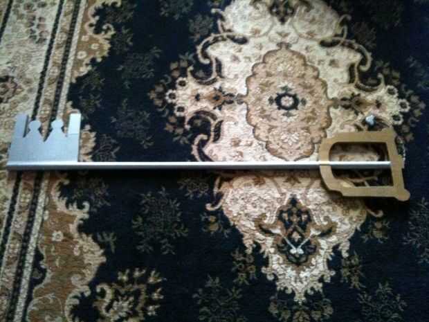 La "cabeza" de la llave espada fue adjuntas por primer corte una sección de la barra, que era aproximadamente 121,5 cm de largo. Entonces la "cabeza" fue colocada en la sección que fue cortada en la barra y tornillo 3 agujeros fueron perforados previamente. Pegamento del tipo PVA, aplicó todo y luego se atornillan los 3 tornillos. Entonces se puso relleno de madera en las uniones y donde estaban las cabezas de los tornillos. Entonces, una buena pelea de lijado para que sea todo suave.