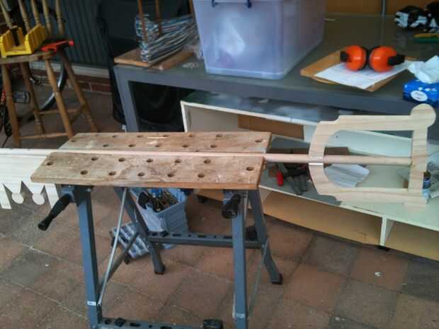 Esto fue hecha de una sola hoja de pino, radiatta, creo, y la barra era apenas un taco muy grueso. La cabeza y la empuñadura se cortaron con una sierra de calar.