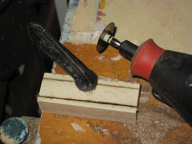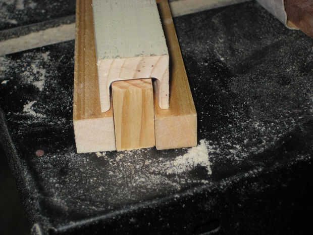 De la abrazadera hacia abajo de uno de los bloques y cortar a lo largo de la línea con el disco de corte. Una vez que se cortan ambos lados, puede levantarse la pieza y romper el pedazo de centro con un destornillador plano y un martillo. Puede dejar un poco más madera de la pieza que necesita, el exceso será arena/archivado apagado. Tenga cuidado de no dividir demasiado apagado. Partir de la madera también puede causar toda la pieza se agriete. Arruiné un par de ello, pero por suerte tenía madera de sobra. Si tienes un buen router disponible, que te sugiero probar que esto primero ya que será probablemente ahorrará mucho tiempo.