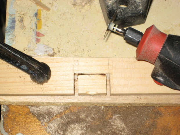 Línea de la frontera en el lado derecho de la Junta. Marque el centro de la clavija de madera en tercer lugar hacia abajo desde la parte superior derecha en la frontera. Asegúrese de marcar la altura de la Junta en la frontera también. Corte una ranura de 1" de esta frontera. Utilizando una regla, medida y trace la forma de la sección para eliminarse.