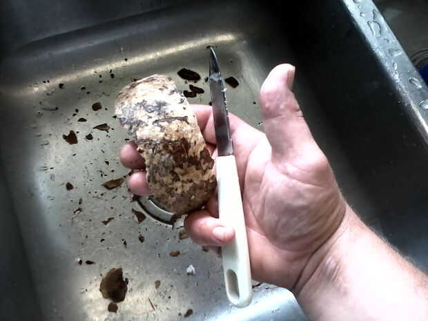 con un cuchillo de palanca hacia fuera el coco de la cáscara. Luego con un cuchillo o veganos pelador quite lo marrón. Ahora corta la mitad del coco y pon en una licuadora.