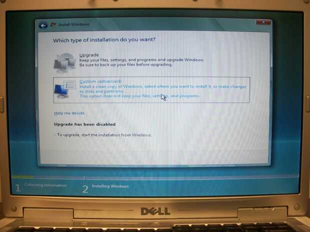 Seleccione "Custom" para borrar el disco duro y reinstalar Windows (reformatear con esta opción)Nota: seleccione "ayudarme a decidir" si no está seguro de qué ruta elegir. Nos gustaría la opción 2 para nuestro propósito.