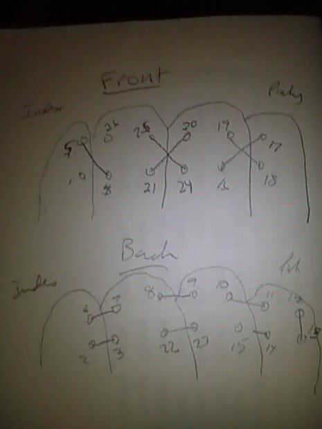 Si el patrón del cordón es complicado, hacer un diagrama. Número de los agujeros según su orden de enlace previsto. Líneas oscuras indican caminos donde el cordón está fuera del guante. Puede utilizar una línea quebrada para indicar donde el cordón atraviesa el guante si no desorden el diagrama demasiado.